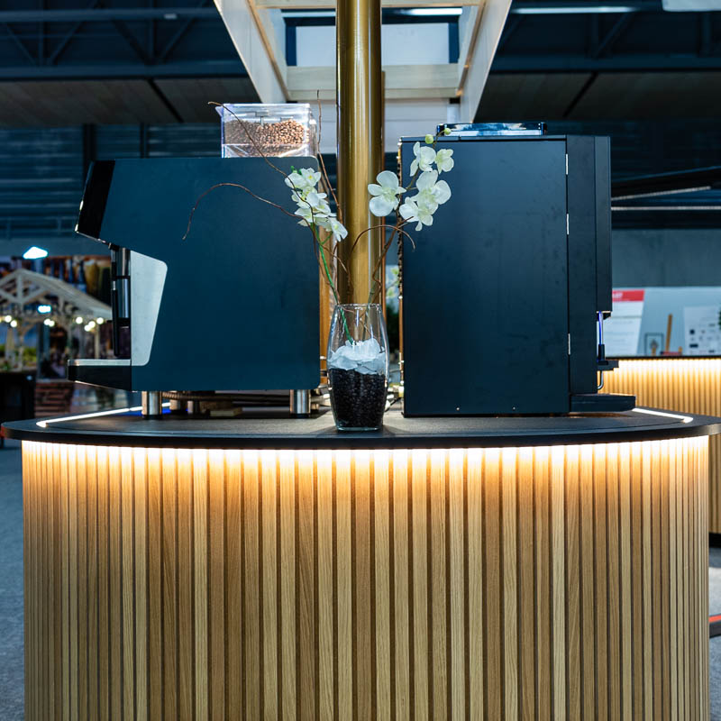 Le stand est composé d'un bar comptoir, d'un présentoir à machines, d'un espace technique et stockage, d'un mural de présentation des produits.